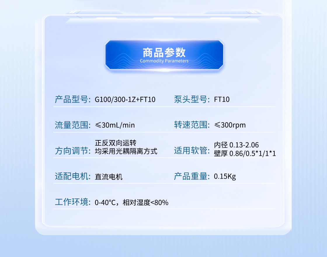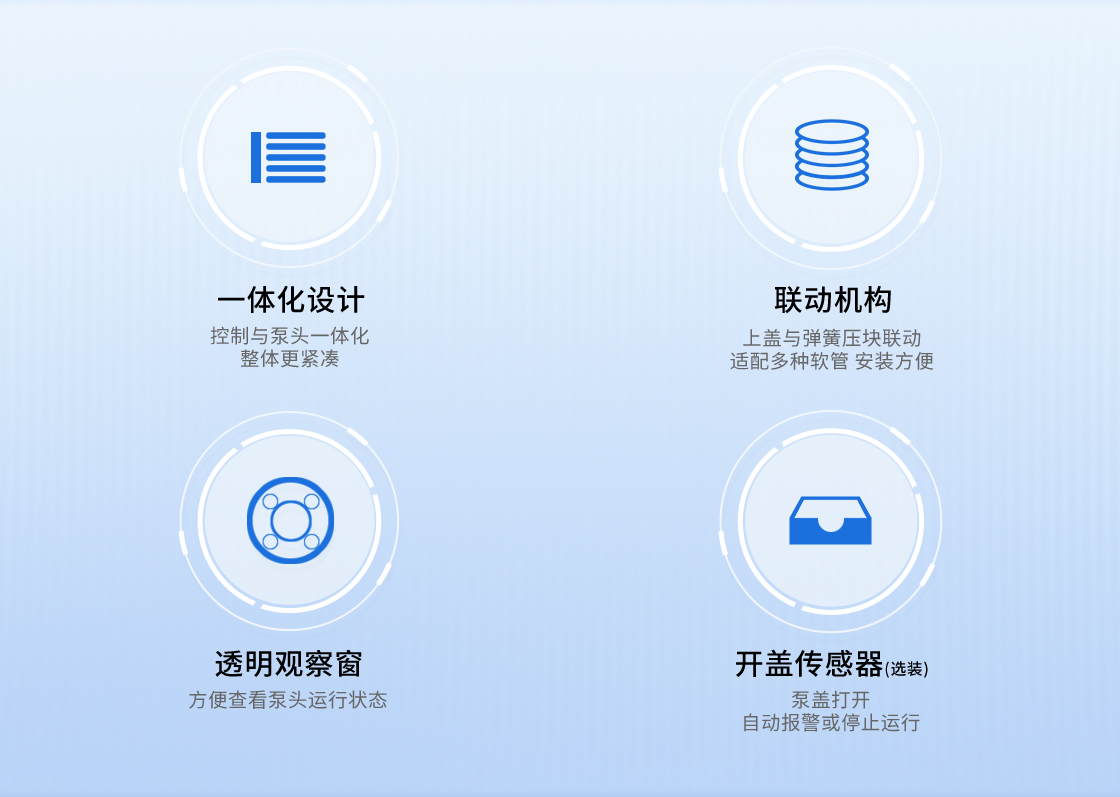 1.流量范圍:<30mL/min 2.控制與泵頭一體化設(shè)計,整體更加緊湊 3.上蓋與壓塊聯(lián)動機(jī)構(gòu),安裝軟管更方便 4.彈管壓塊,可適配多種軟管 5.直流電機(jī)驅(qū)動泵 6.透明觀察窗可方便查看泵頭運(yùn)行狀態(tài) 7.開蓋傳感器(選裝):泵蓋打開,自動報警或:停止運(yùn)行