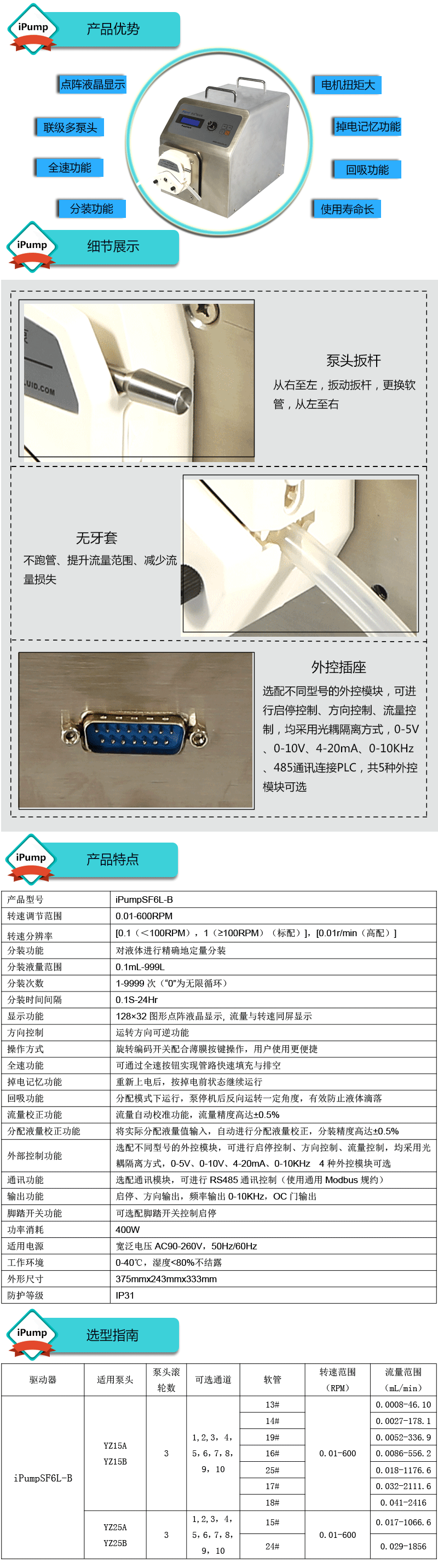 1.流量范圍:0.029-2416mL/min 2.兩種工作模式,流量模式與分配模式可選 3.具有流量校正、分裝液量校正功能 4.分裝精度高達±0.4%以內 5.采用伺服電機驅動,控制準,動力強勁 6.線路板全部三防漆處理,防腐、防潮