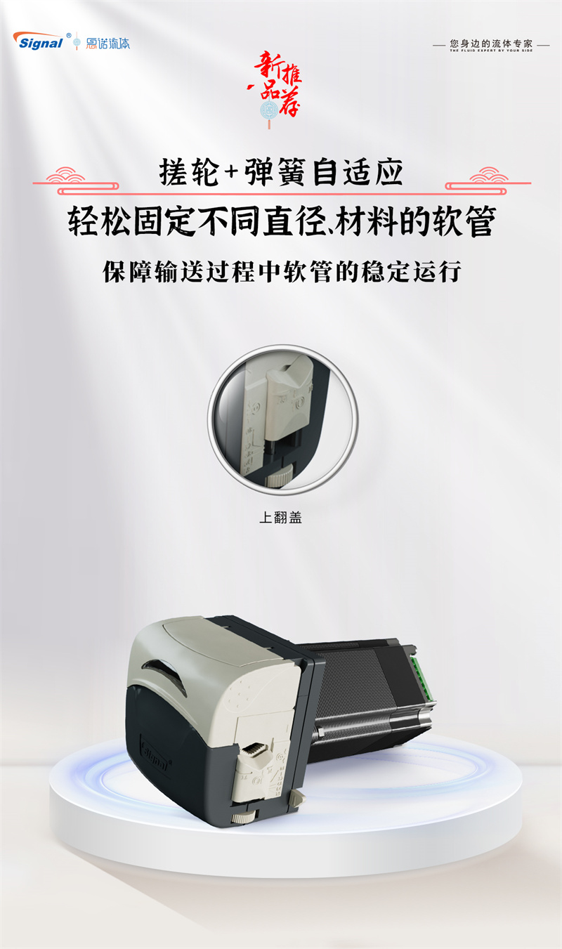 3.?上翻蓋設計,可快速的將上壓塊與泵體分離,簡化了軟管的安裝和更換流程,顯著提升維護效率。
